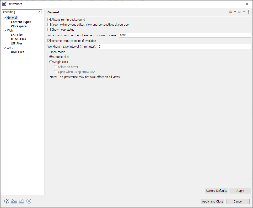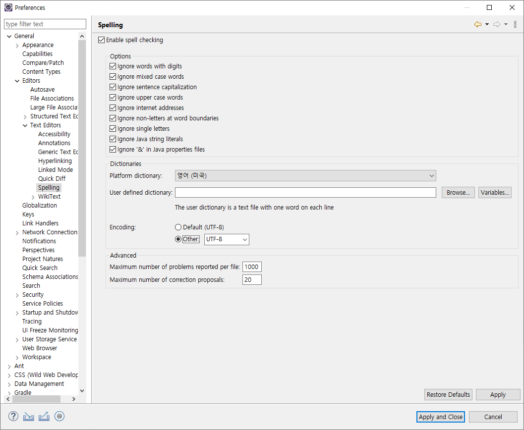 6. General > Editors > Text Editors > Spelling을 선택해서 Other를 UTF-8로 변경한 후 Apply and Close