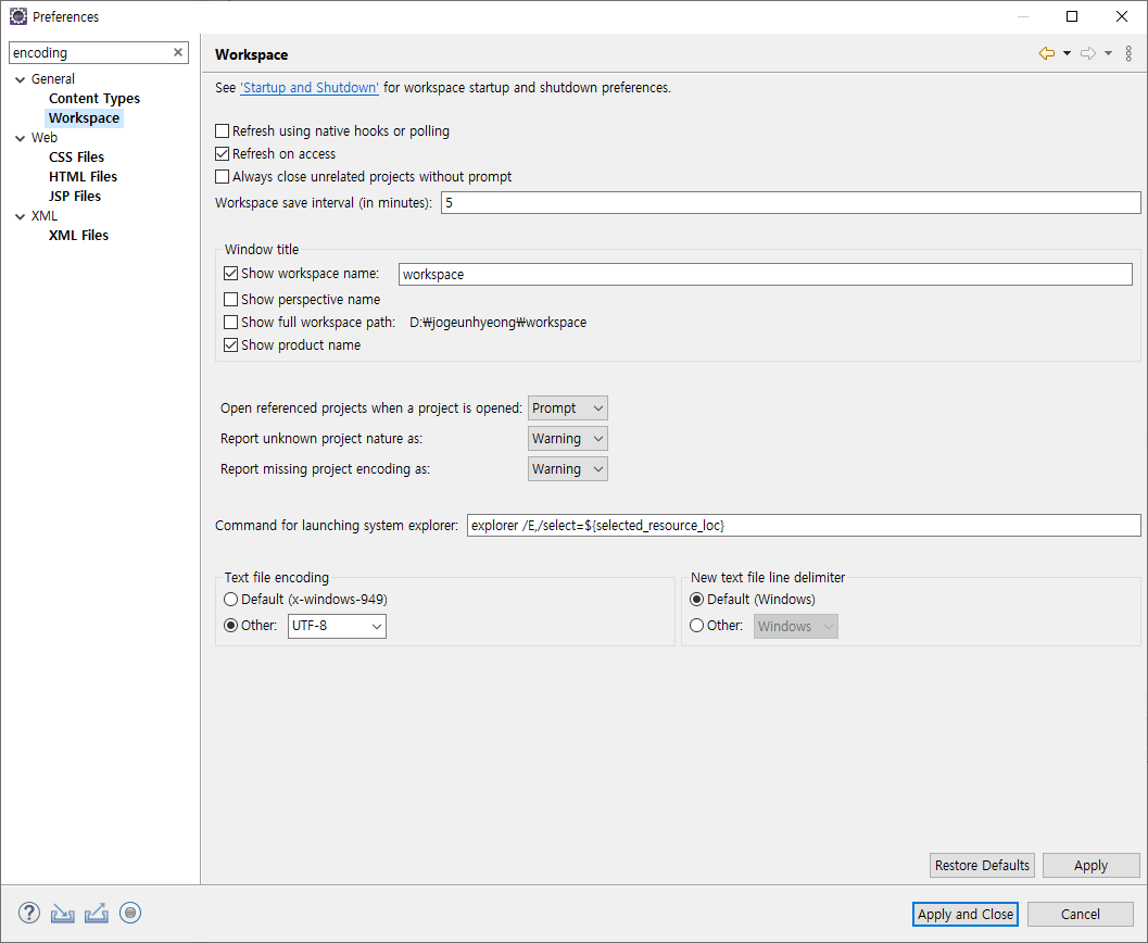 4. Workspace > Other를 UTF-8로 변경 Apply