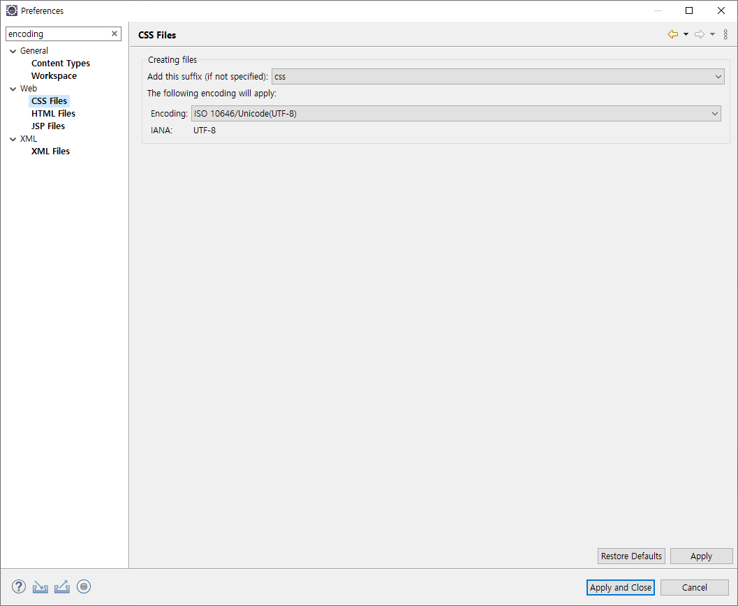 5. CSS Files, HTML Files, JSP Files, XML Files > ISO 10646/Unicode(UTF-8)