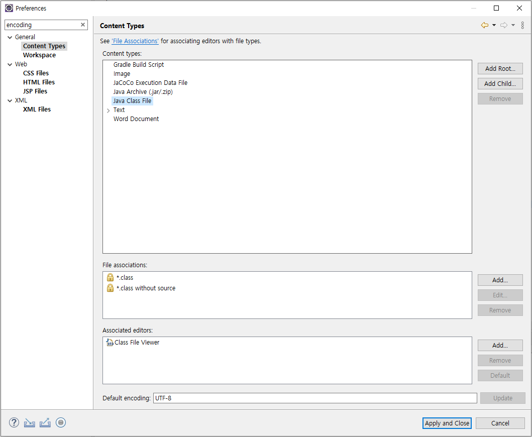 3. Content Types > Java Class File, Text를 각각 선택 후 하단의 Default encoding 입력란에 UTF-8을 입력하고 Update